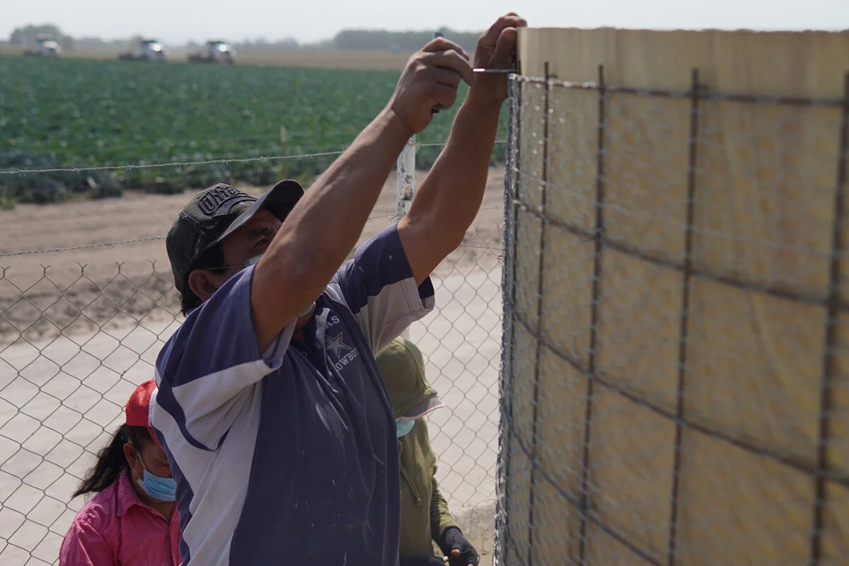 Photo: A community member building a Rainwater Harvesting System in the community of Jerico de María (in the background you can see an agricultural camp with modern irrigation systems).